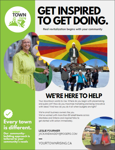 In September 2024, we were hired to work with six small towns and villages in rural Manitoba. We met with locals and businesses, did downtown walkabouts with stakeholders, and presented fresh ideas for marketing, placemaking, public art, and community building. We spent a week in this region doing work for Russell, Binscarth, Shoal Lake, Strathclair, Minnedosa, and Neepawa, Manitoba. This trip was our second to rural Manitoba to inspire small communities.